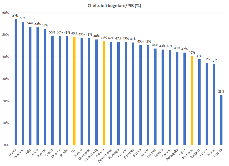 Asa cum se observa din graficul de mai sus realizat cu sprijinul colegilor din departamentul de analiza al BCR, cheltuielile bugetare raportate la PIB ale Romaniei sunt printre cele mai scazute din UE. DIferenta este de 9 puncte procentuale fata de media UE si de 7 puncte procentuale in comparatie cu Polonia.